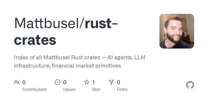 Shmungus Saturday, March 07, 2026I've been building the substrate layer for production AI systems in Rust. This is the index repo for 10 crates I shipped this week. The AI side covers agent memory (episodic, semantic, working with decay and multi-agent bus), cost governance with hard budget enforcement and automatic model downgrade cascade, CRDT state sync for distributed agent fleets, output versioning with full lineage tracking, a knowledge graph on top of agent memory, LLM inference primitives for WASM and edge runtimes, and a complete ReAct loop that runs inside a Cloudflare Worker. The financial side covers market primitives (orderbook, OHLCV, indicators, position, risk) and a streaming ingestion pipeline handling 100K+ ticks/second across 4 exchanges.
